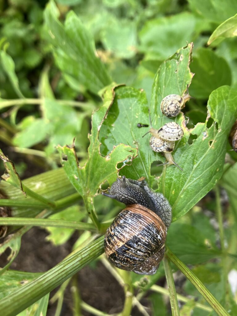 Voldsneglene lægger æg først på sommeren og en gang i juli myldrer det med små, bløde næsten gennemsigtige babysnegle. Man opdager det ved at kålen pludselig er forvandlet til kniplingsbroderi …
